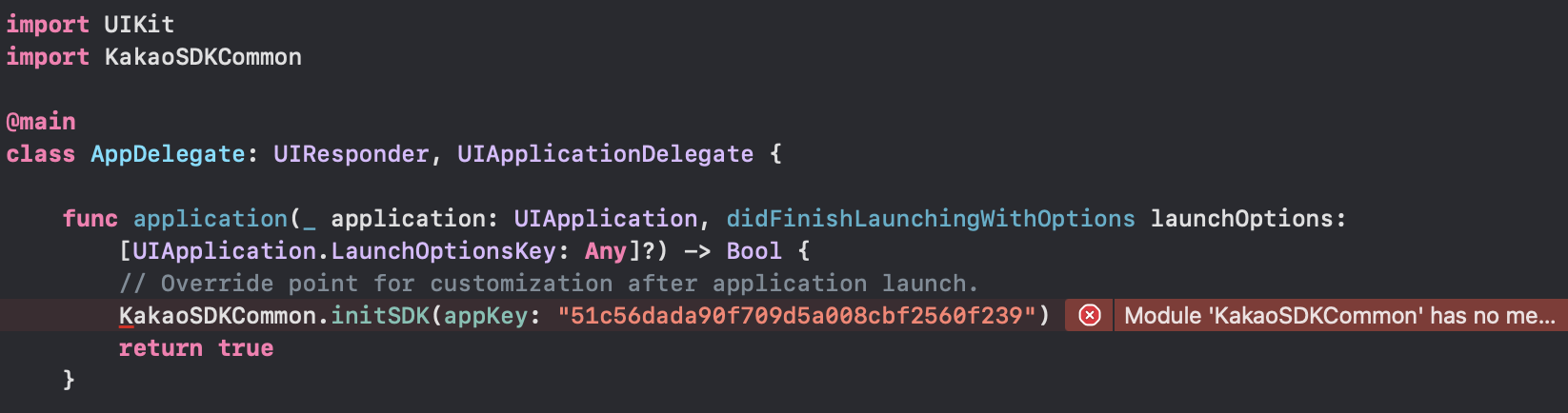 그리고 네이티브 앱 키를 사용해 iOS SDK를 초기화하는 과정이 필요한데, AppDelegate.swift에 Kakao SDK를 초기화하는 아래와 같은 코드를 추가하면 된다.