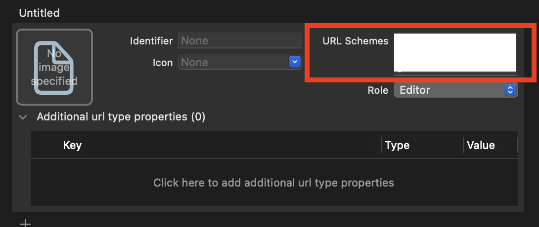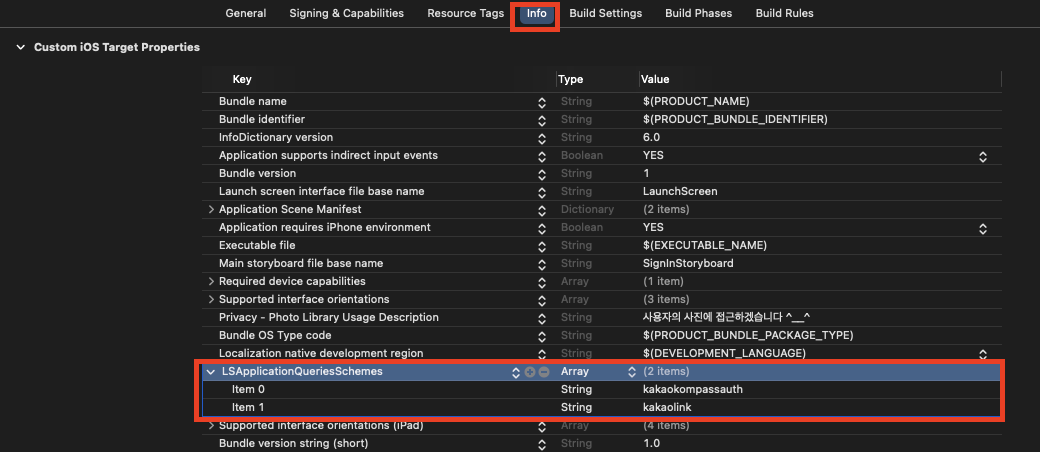 [Info] > [URL Types] > [URL Schemes] 항목에 네이티브 앱 키(Native App Key)를 'kakao{NATIVE_APP_KEY}' 형식으로 등록하면 된다.