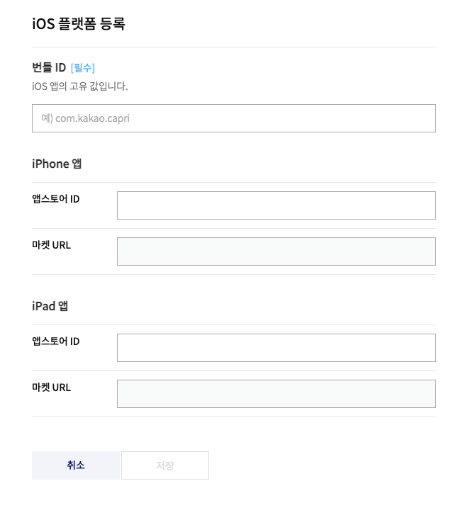 iOS 플랫폼에는 번들 ID, 앱스토어 ID, 마켓 URL을 등록할 수 있는데