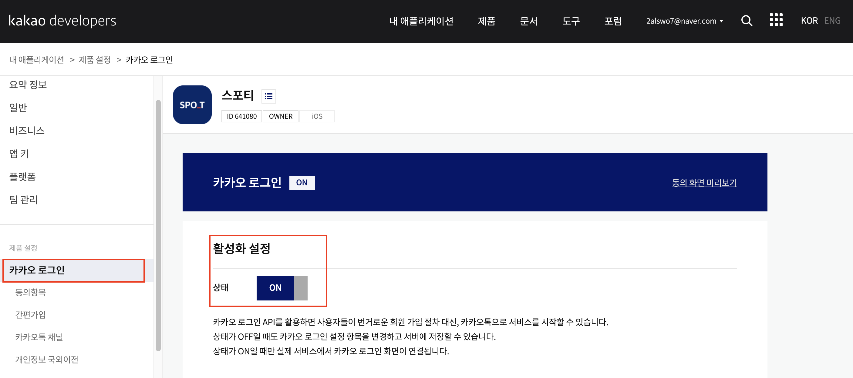[제품 설정] -> [카카오 로그인]으로 옮겨가 카카오 로그인의 활성화를 눌러준다.