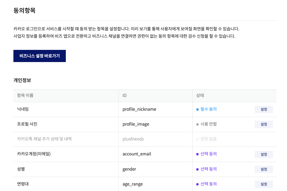 [제품 설정] -> [동의항목]에는 원하는 개인 정보의 동의 항목을 설정할 수 있다.