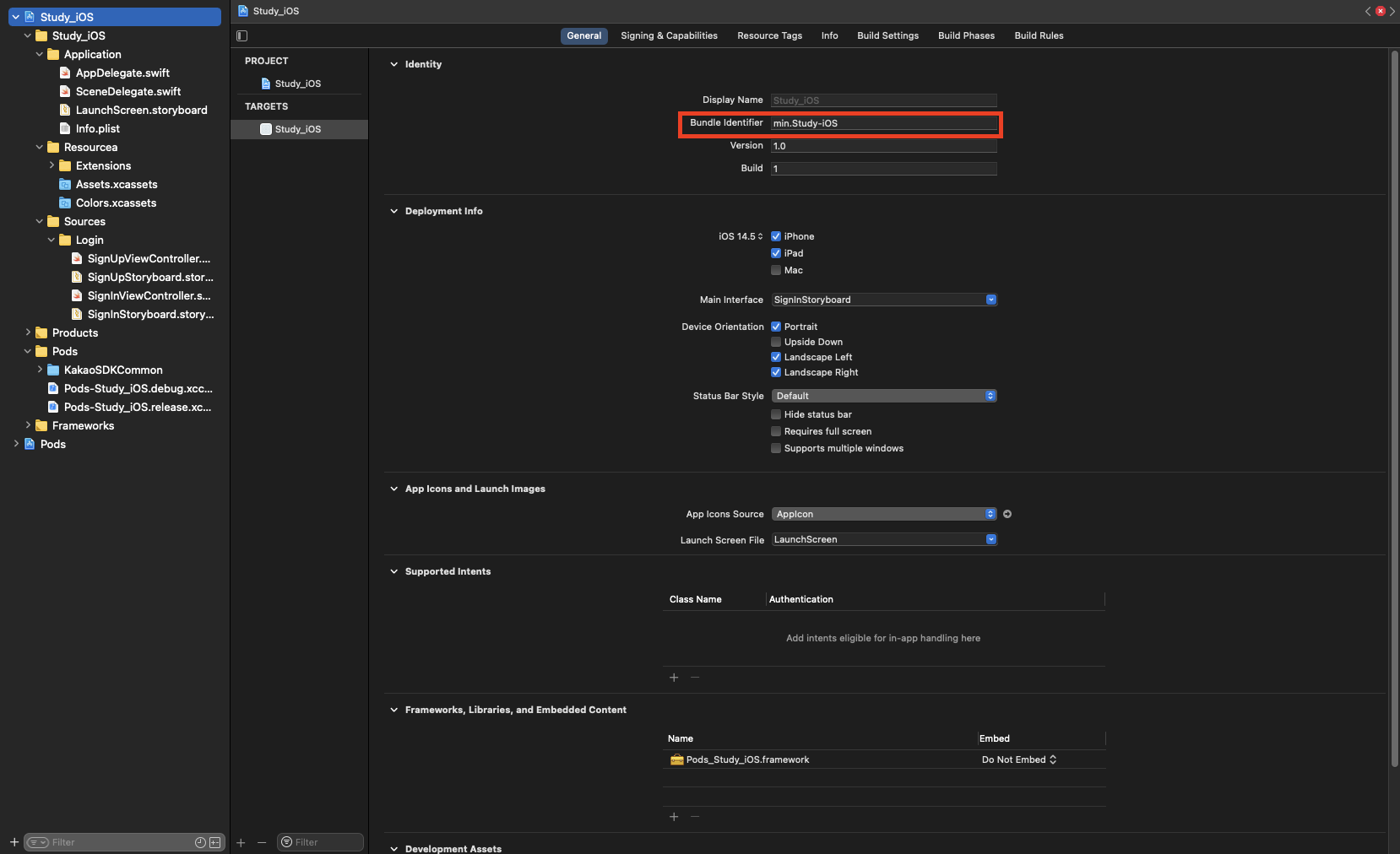 필수로 등록해야 하는 번들 ID는 Xcode의 프로젝트 정보에서 확인할 수 있다.