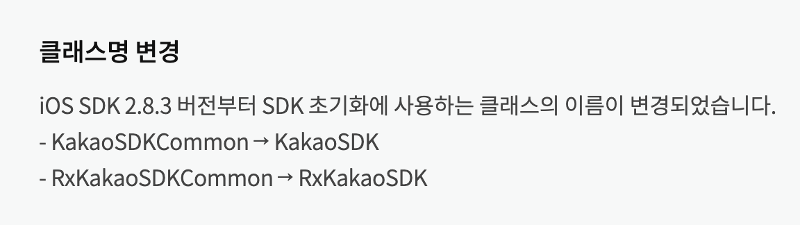 이는 오른쪽 사진 카카오 공식문서에 쓰여있는 것과 같이 iOS SDK 2.8.3 버전부터는 SDK 초기화에 사용되는 클래스의 이름이 변경된 까닭 때문인데,