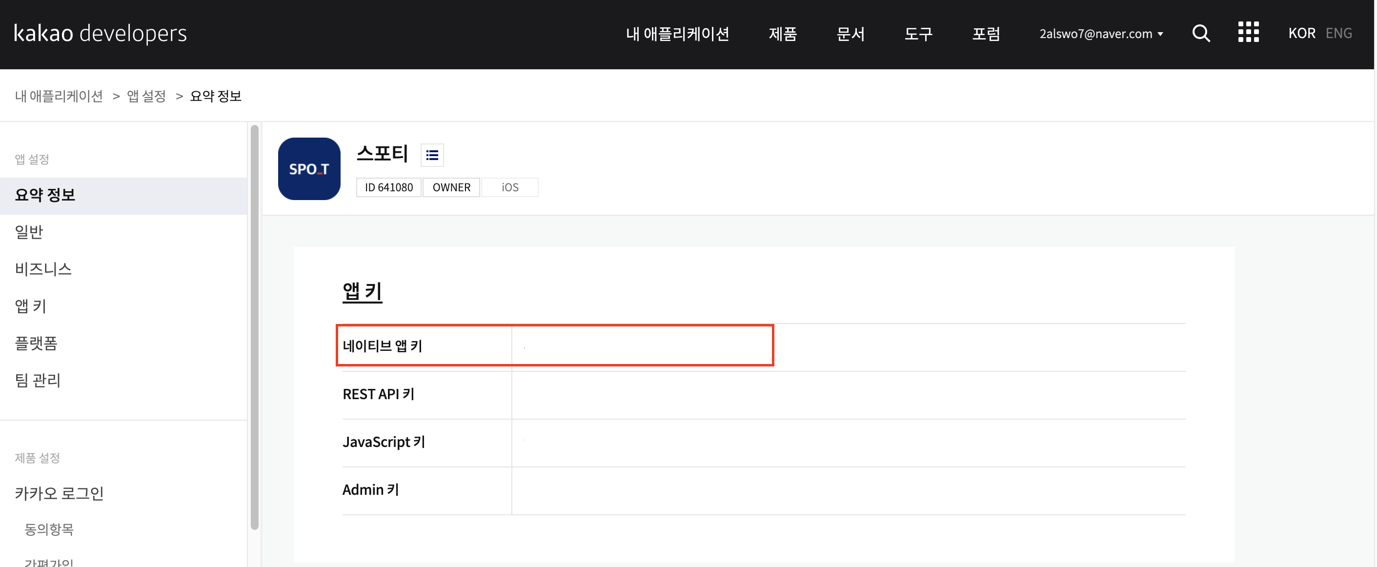 아래와 같이 네이티브 앱 키, REST API 키, JavaScript 키, Admin 키가 발급된다.