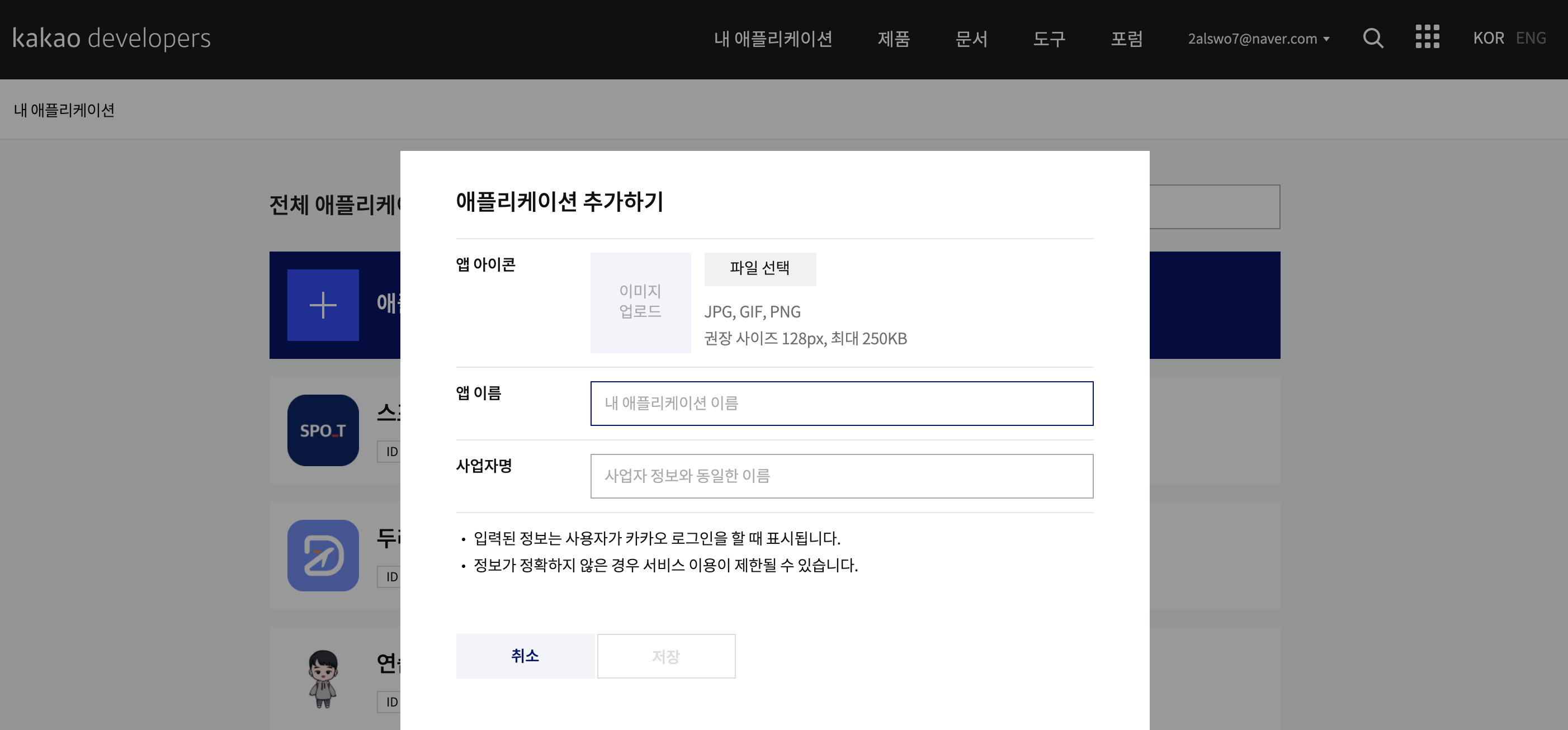 카카오 API와 비즈니스 솔루션 등 카카오 플랫폼을 이용하려면, 카카오 플랫폼을 등록해줘야 한다.