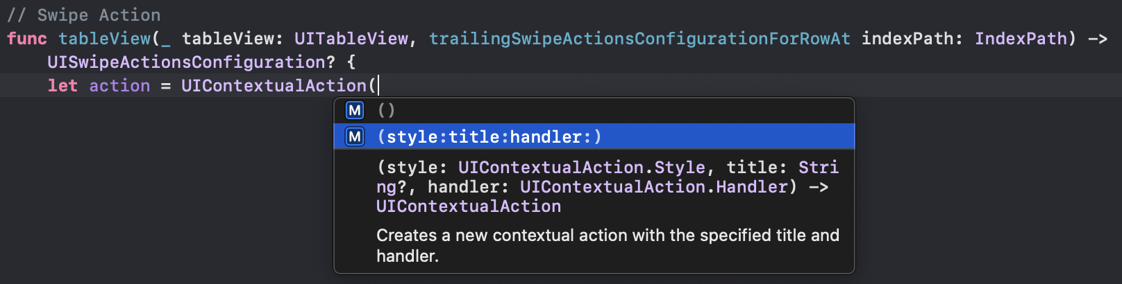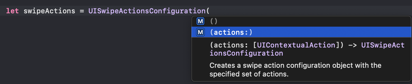두 메서드 모두 UISwipeActionsConfiguration 객체를 반환하는 형태인데, 해당 객체는 인수로 UIContextualAction을 담아 같이 보내게 된다.