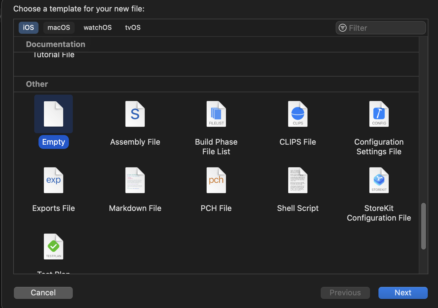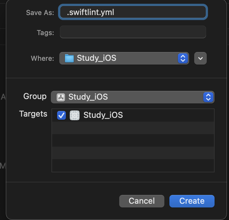 보이는 것처럼 프로젝트 바로 아래에 Empty -> .swiftlint.yml 라는 이름의 파일을 하나 만들어주자.