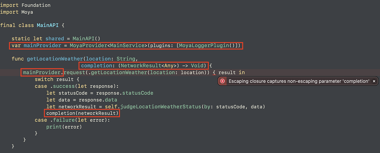 함수 외부에 선언된 mainProvider()라는 변수에 의해 호출되는 request의 한 case에서, 파라미터로 받았던 completion 클로저를 호출하려고 하였지만 mainProvider()라는 변수는 getLocationWeather() 함수 외부에 존재하기 때문에 에러가 발생한 모습이다.