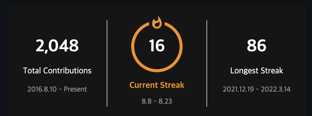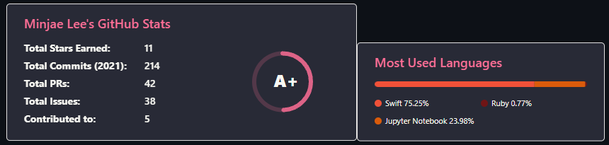 이 역시도 내 깃헙에 대한 Stats를 표현하는데, 위의 방식과는 다른 형태로 보여주는 방식이다.
