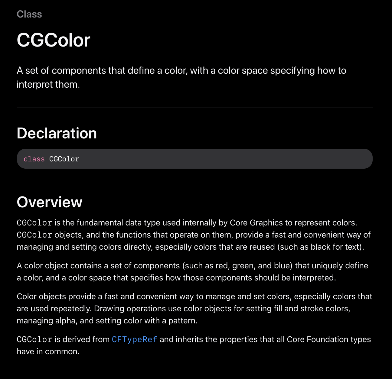 CGColor는 색상 해석 방법을 지정하는 색상 공간과 함께 색상을 정의하는 구성요소 집합이라는 설명이 쓰여 있었다.