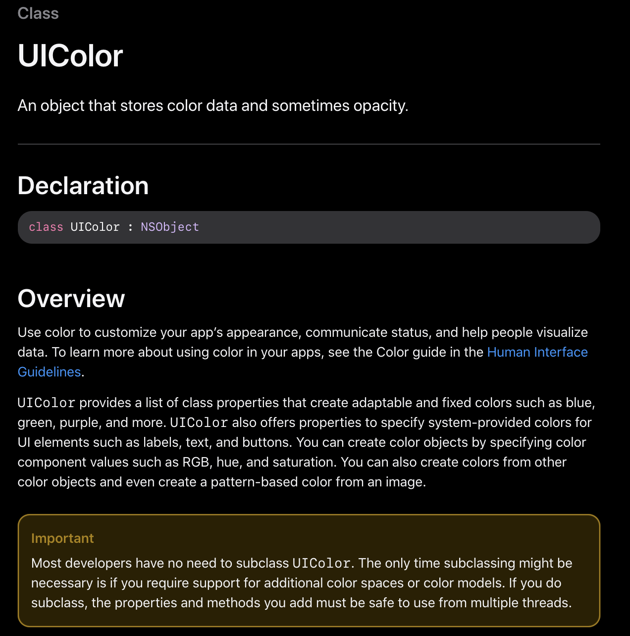 즉, UIKit 프레임워크에서 사용하는 요소의 색상값은 → UIColor로 지정