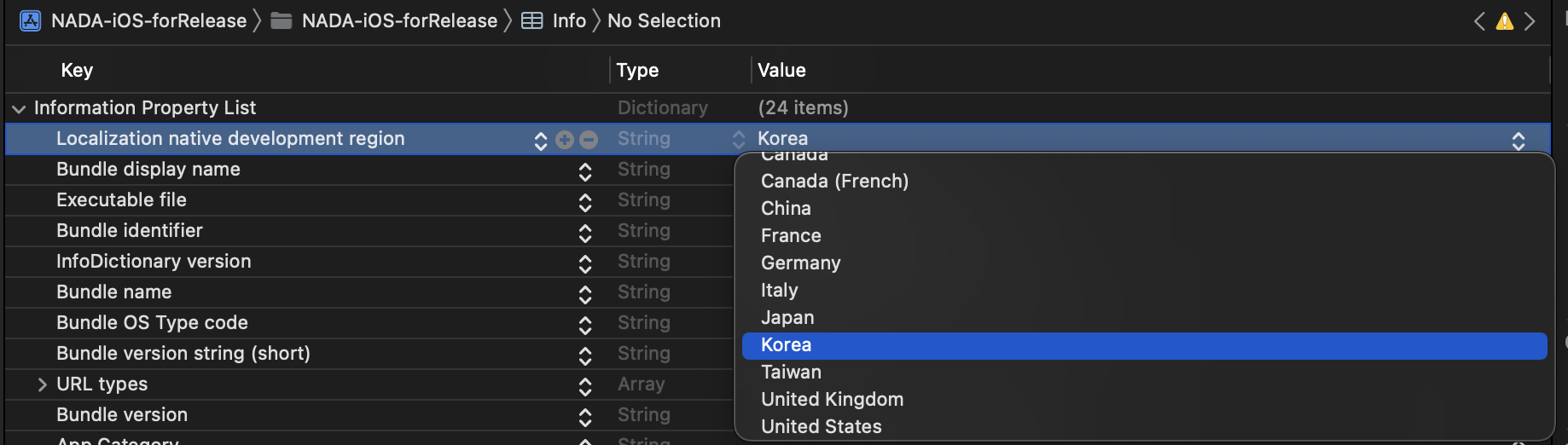 Info.plist -> Information Property List -> Localization native development region을 Korea로 변경해주면 된다.