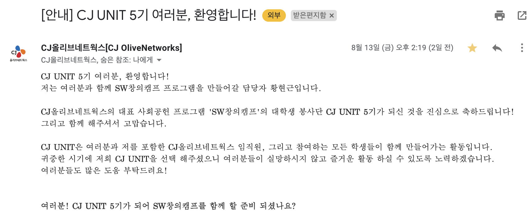 [CJ UNIT 5기] #1 - CJ SW창의캠프 대학생 봉사단 최종 합격 후기